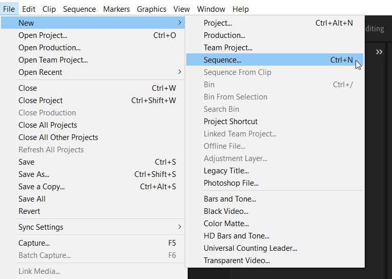 - Go to File > New > Sequence. A window will come up where you can select sequence settings.