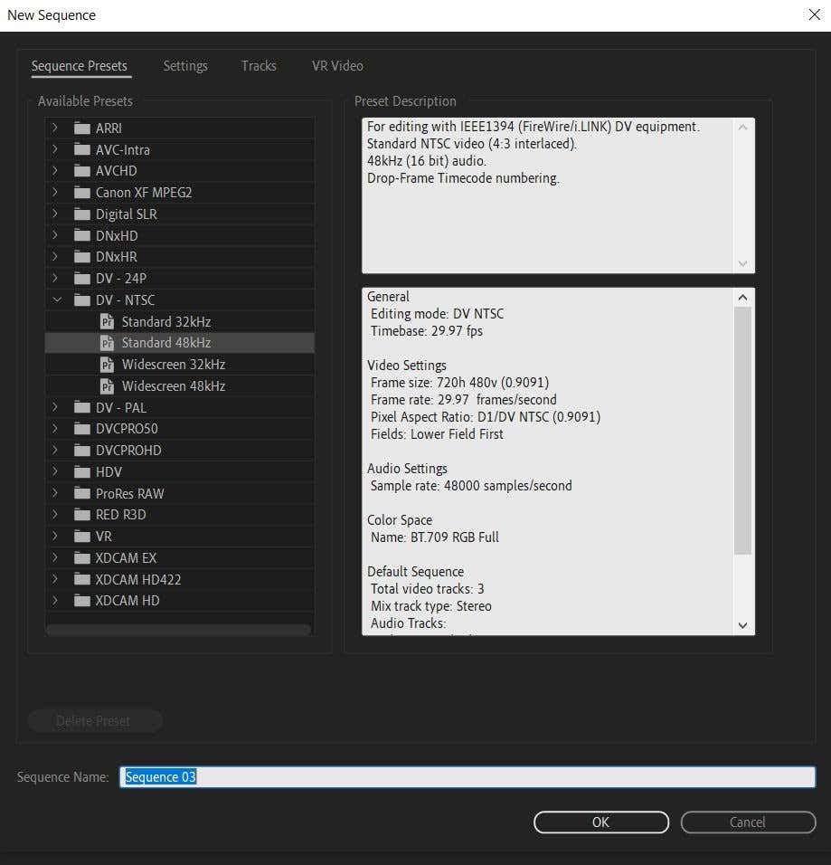 2. Choosing sequence presets usually depends on what kind of camera you used to film, but since we’re making a graphic we’ll just choose the Standard 48kHz option under DV – NTSC.