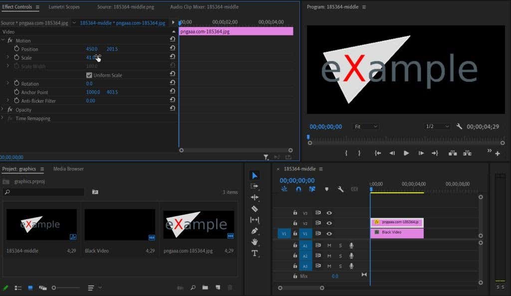 2. Now, drag the graphic/logo into your timeline. If the graphic is too big or too small, we can fix this in the Effect Controls panel. Select the clip of the graphic in your timeline, and in Effect Controls locate the Scale option. Increase or decrease this value to fit the graphic to the video as you wish.