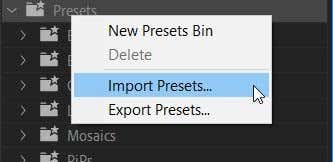 - In Premiere, go to Effects and right-click on Presets. Select Import Presets, then in the file explorer find the preset you downloaded.