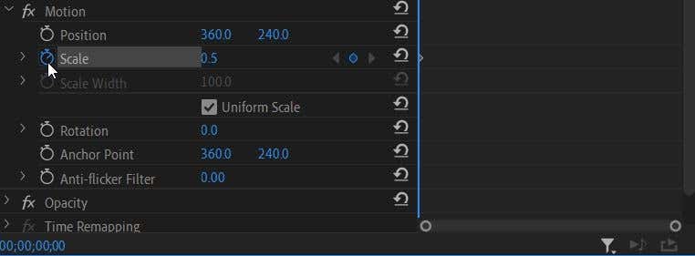- Set the effect value to where you’d like the animation to start. We want the graphic here to start small, so change the Scale value to 0.5. Set a keyframe by clicking on the stopwatch.