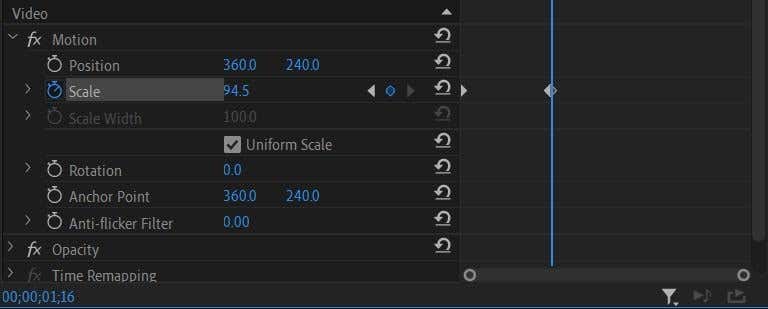 3. Now, move to a point in the video where you’d like the effect to be changed. Since we want to increase the size of the graphic over time, we’ll move the timeline cursor to where we want the animation to end and set the Scale value to the largest size we want it to be. A new keyframe will automatically be set.