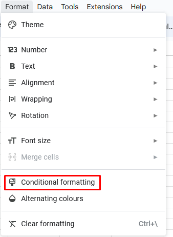 - Select Conditional Formatting from the drop-down menu. The Conditional Formatting menu will open on the right side of the Google Sheet.