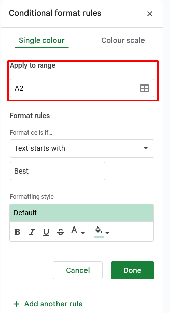 - If you want to apply Conditional Formatting to multiple cells that contain the same word, you’ll have to input the range to which the formatting will be applied. Click on the Apply to Range box.