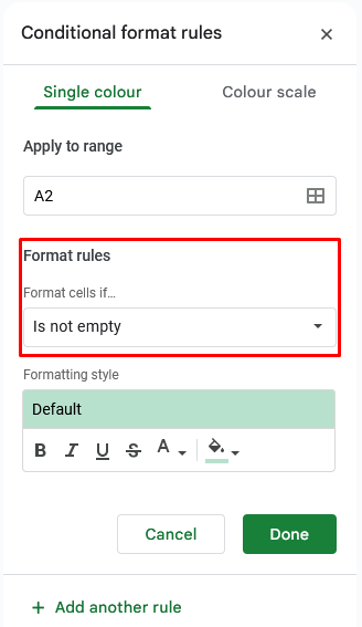 Note: Conditional formatting is less powerful in Google Sheets compared to Microsoft Excel. The former limits you to 50 rules per sheet, while you can create up to 256 rules in Excel to highlight your data.