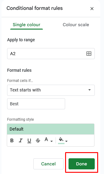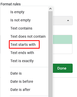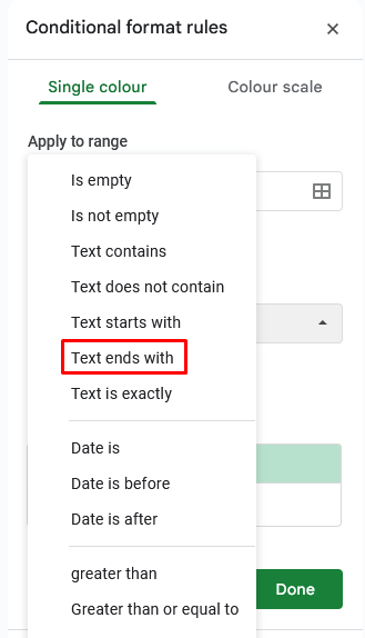 All the steps before and after this are the same as described in the previous section. Once you are ready to apply the highlight to all the cells that end with a specific word, phrase, or value, hit the Done button.