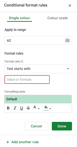 - In the Value or formula box, type in the specific word (or a custom formula) with which the cell begins.