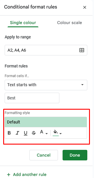 - In the Formatting Style section, you can select the text and background color you want added to the text or the whole cell and text formatting options such as Bold, Italic, and Strikethrough.
