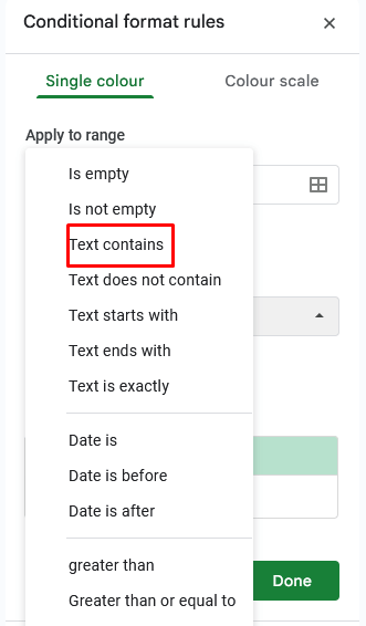 You probably guessed that to highlight text that contains a specific word you have to follow the same steps as previously described in the Conditional Formatting section. But when you reach the point to select Format rules, you’ll choose Text contains from the drop-down menu.