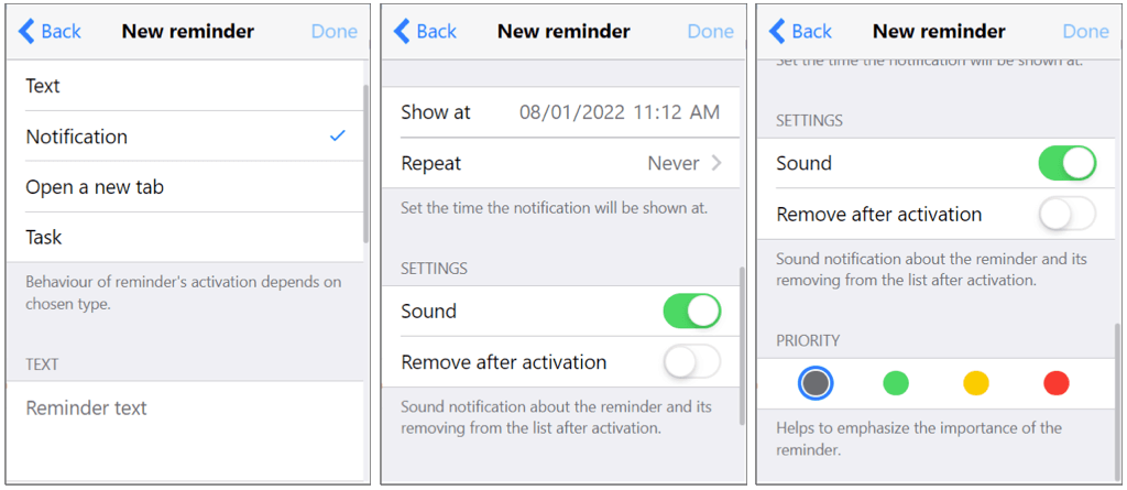 All options except the text type let you select the date, time, and optionally repeat the reminder. Add a description, choose a color for its priority, and select Done on the top right.