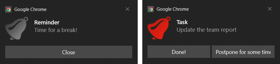 Simply named, the Reminders extension for Chrome is flexible and easy to use. Start by choosing a reminder type like text, notification, new tab, or task.