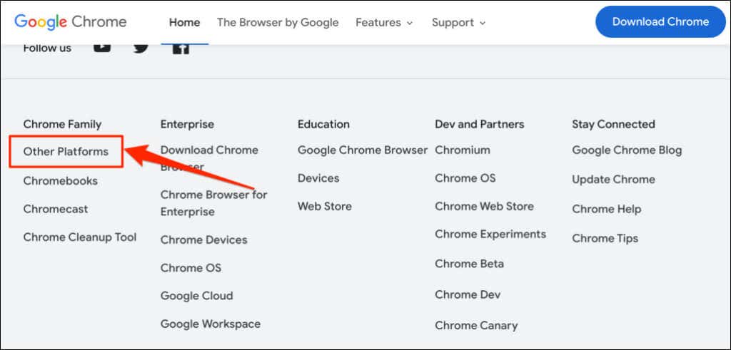 You’ll get the 64-bit download link on a 64-bit PC and the 32-bit download link on 32-bit devices. Google also gives users the liberty to download either the 32-bit or 64-bit version of the browser. Scroll to the bottom of the Chrome download page and select Other Platforms.