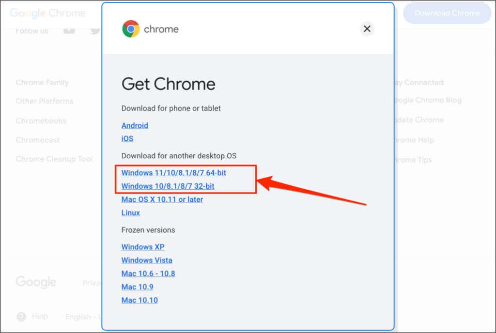 Select your preferred version (32-bit or 64-bit) on the “Get Chrome” pop-up page.