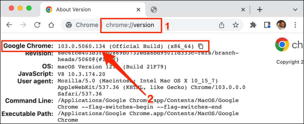 Open Google Chrome on your Windows, macOS, or Linux computer and enter chrome://version in the address bar. Check the “Google Chrome” row at the top of the page for the browser version.