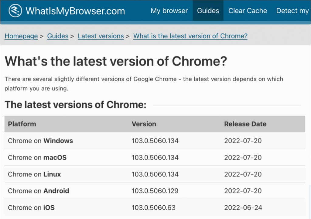 You now know how to check Chrome’s version. The next step is verifying if you have the latest browser version on your device. WhatIsMyBrowser.com keeps an updated summary of the latest Google Chrome web browser versions and their release dates.