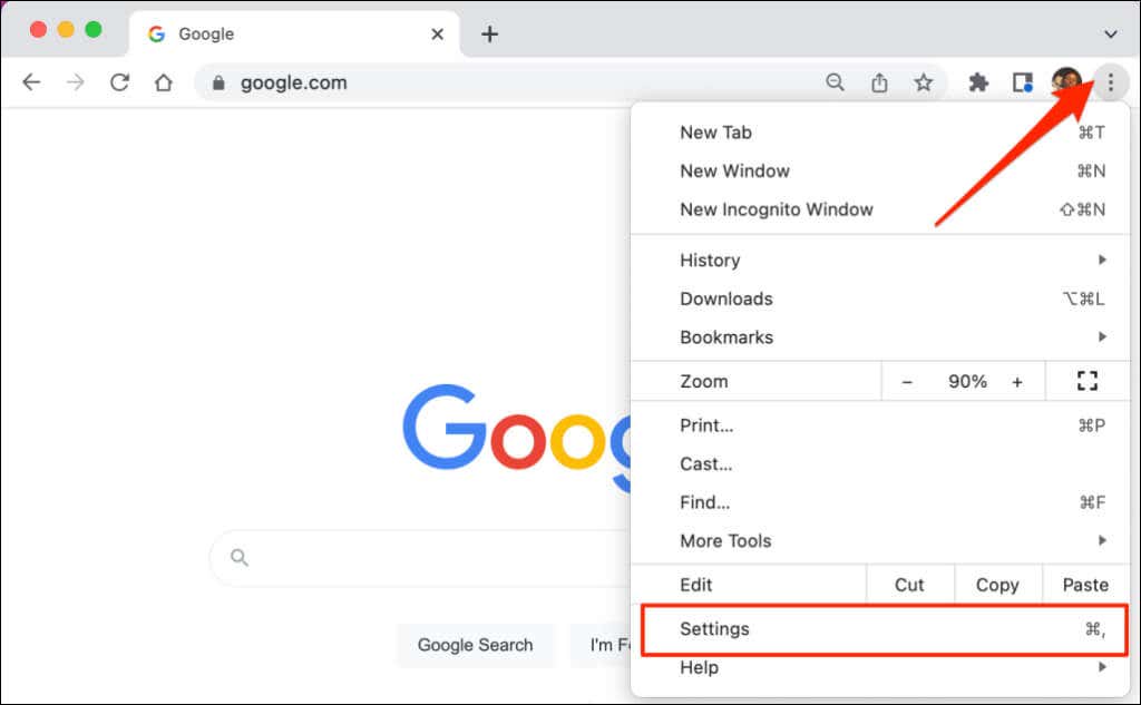 - Launch Chrome, tap the More icon in the top-right corner, and select Settings. Alternatively, press Command + comma (,) on your keyboard for quicker access.