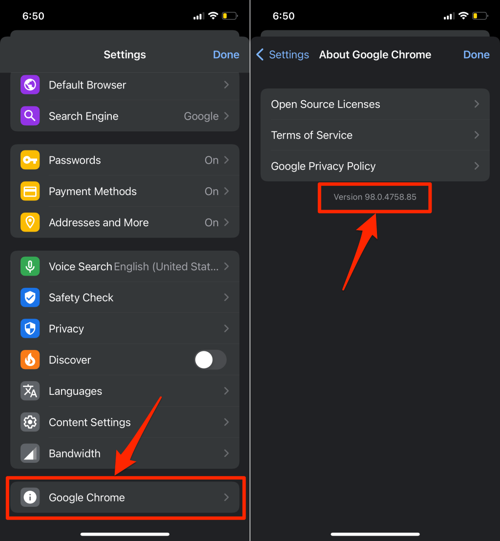 Follow the steps below to check the Google Chrome browser version installed on your iPhone or iPad.