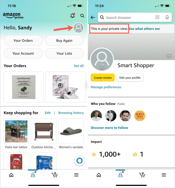 - Tap your Amazon profile icon in the top right corner. You should see a message at the top letting you know this is the private view of your public profile.
