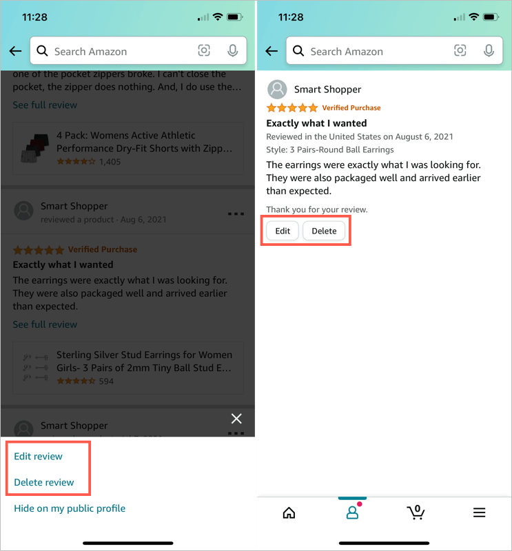 While in the Amazon mobile app, access your reviews as described earlier.