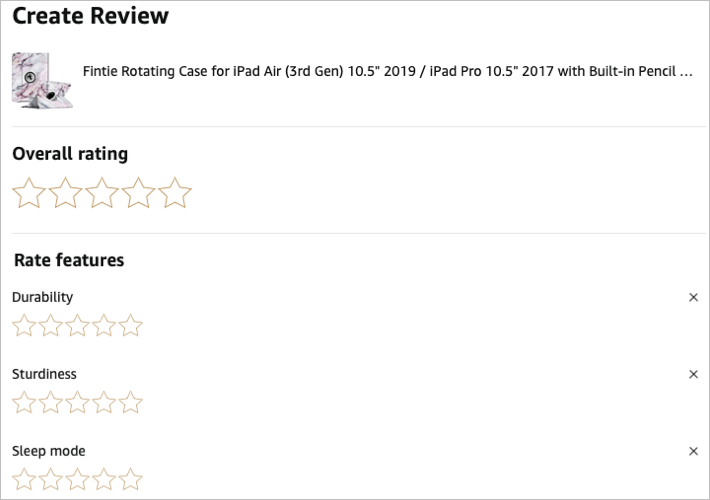- Start by adding an overall star rating for the product. You can then rate the product per individual category if you like. These categories vary depending on the type of product you’re reviewing.