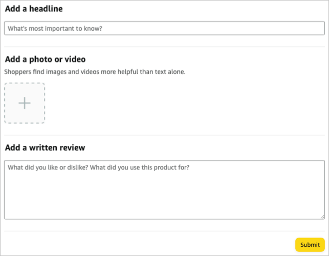 - Add a headline for the title of your review and optionally include photos or videos if you believe it’ll help other shoppers.