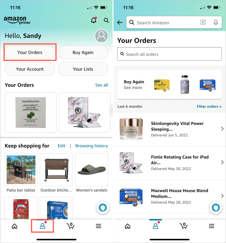 - Open the Amazon mobile app and go to the profile tab.