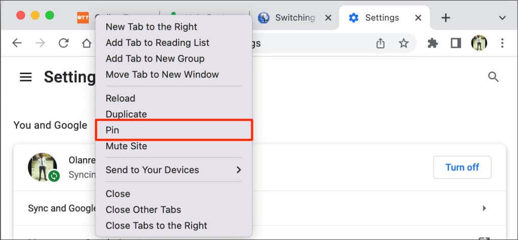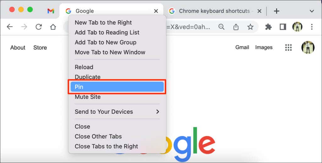 Alternatively, right-click the tab and press P on your keyboard. Chrome will highlight the Pin option on the menu. Press Enter/Return to pin the tab.