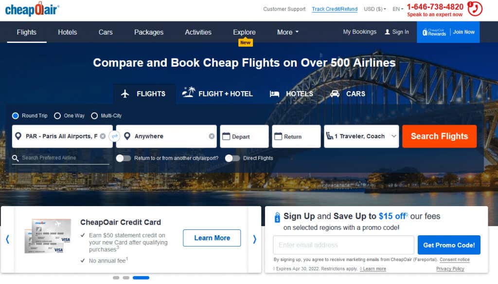 CheapOair also has a reward program based on a point system. You will receive your first 500 points just for signing up. Then, the site will add another 500 points to your account after your first booking, hotel, or flight. After you collect these initial 1000 points, each dollar spent through CheapOair will land you another 1 point. You can also opt for a CheapOair credit card that will add $7 for each dollar spent.