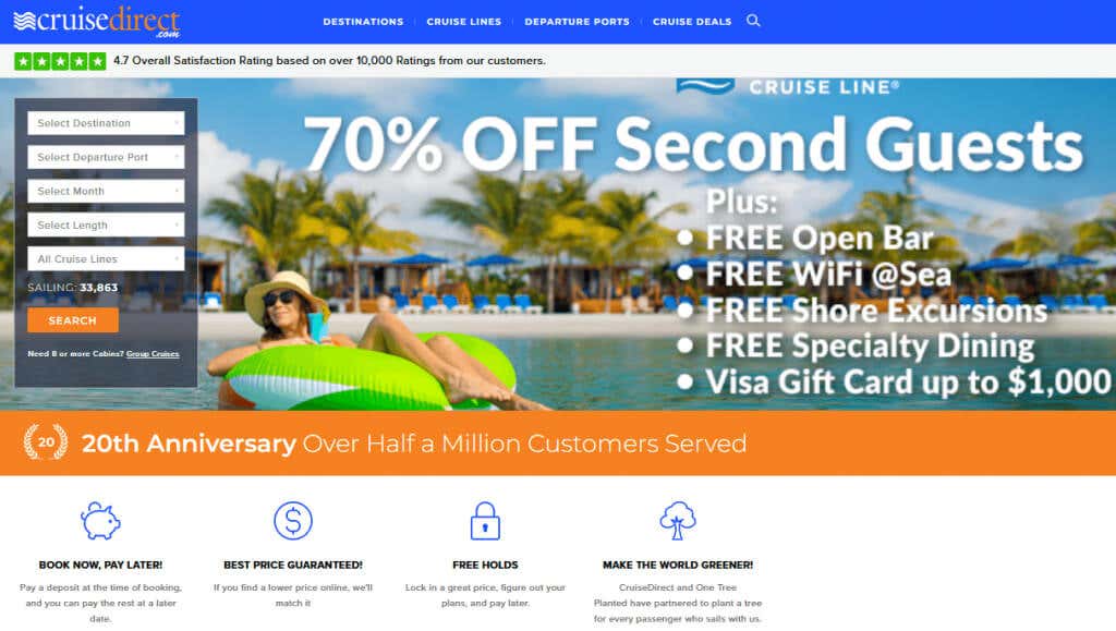 Cruise Direct doesn’t charge booking fees, and it offers a price match guarantee. However, the website doesn’t offer any exclusive cruises to its users.