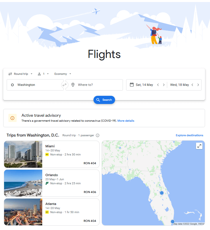 If you want a simple and clean search engine with some handy filters for finding last-minute flights, Google Flights might be what you’re looking for. Use the map view to see the prices all over the world. This is particularly useful for flexible travelers who don’t care much about the destination.
