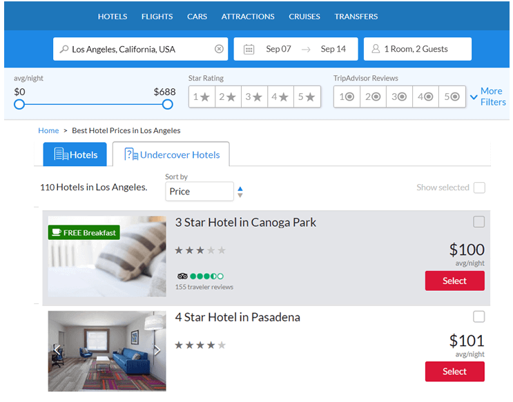 If adventurous, you will love the “Undercover Hotels” feature. Super low travel offers will keep the hotel’s identity a secret until you complete the booking. However, you won’t go through the booking process blindly. You’ll know the hotel’s general location, rating, and review score. With “Undercover Hotels,” you can get up to 65% discounts on your hotel room.