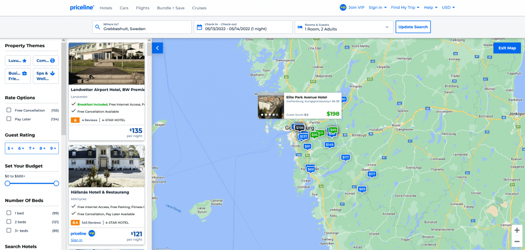 For those who don’t want to take the risk with Express Deals, Priceline offers a very detailed and easy-to-use map that shows all accommodations available for your last-minute trip. Once you hover the cursor over the location (labeled with the price), a pop-up display will tell you the hotel’s rating, name, and guest review score.