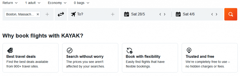 Kayak is a search engine that will allow you to find flights, but you won’t book them with Kayak. The search engine will not charge any fees for the booking, and there are no hidden charges you need to worry about. You can use many filters that Kayak has to offer to narrow down the search to match your exact criteria.