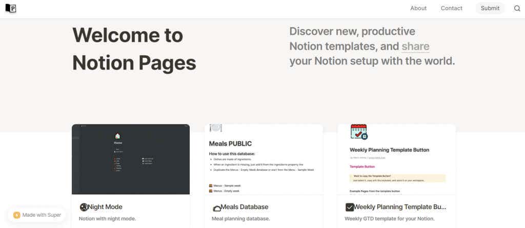 Notion Pages mirrors the more visual presentation of the official Notion Picks, arranging the templates in a gallery on the front page. The templates are accessible with a click and include a brief description to tell you what it is for.