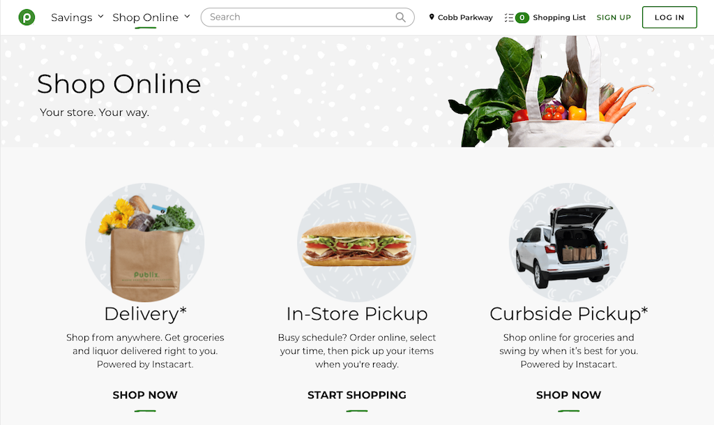 At the height of the pandemic, many people were afraid to go into stores. Walmart, Publix, Kroger, and many other big-box stores opened up online ordering. You can order your groceries online and a team member will bring them to the front of the store for curbside pickup.