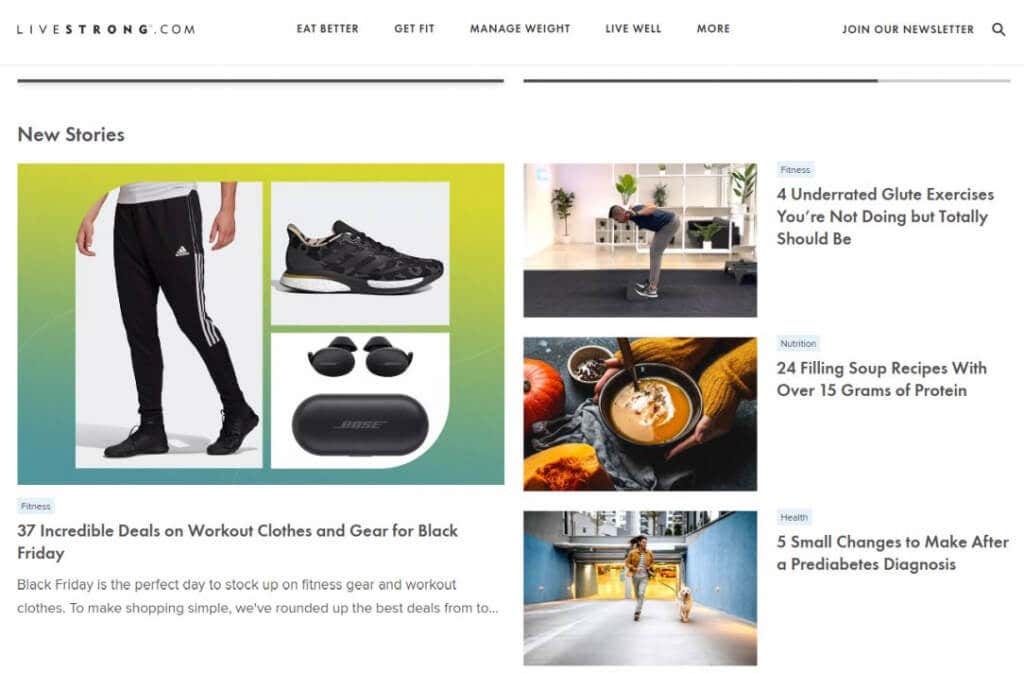 - Article topics cover fitness, healthy eating, and weight loss