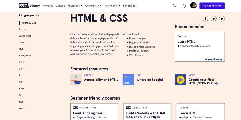 There are tons of easy-to-understand lessons available on Codecademy for various coding languages, such as Python, HTML, CSS, and Java. For each language, you’re guided through interactive lessons so you can grasp the basic skills.