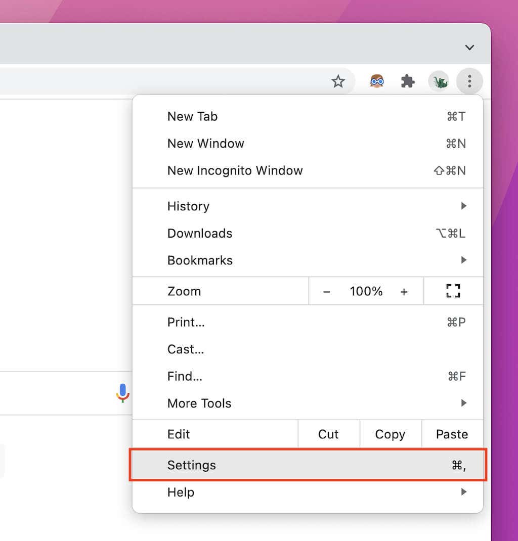 1. Open the Chrome menu (select icon with three dots at the top-right of the window) and choose Settings.