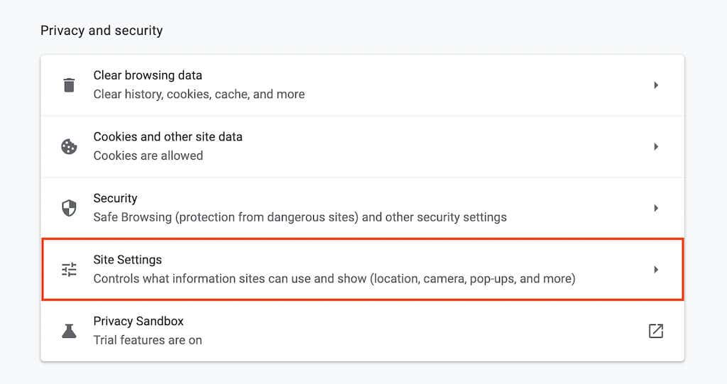 2. Select Cookies and Site Permissions on the sidebar.