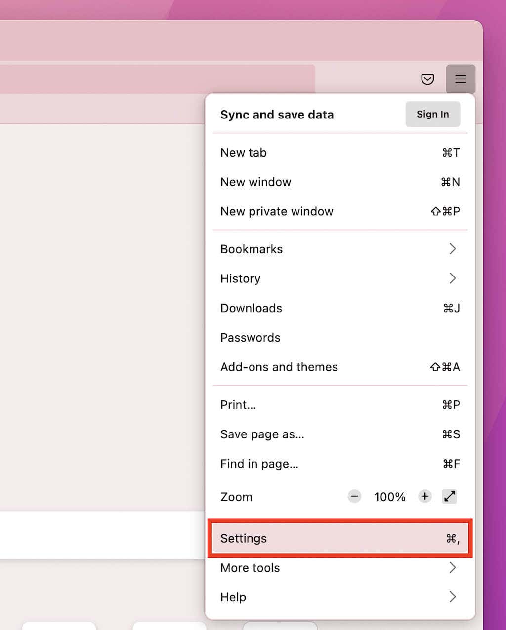 1. Open the Firefox menu (select the icon with three-stacked lines at the top-right of the screen) and choose Settings.