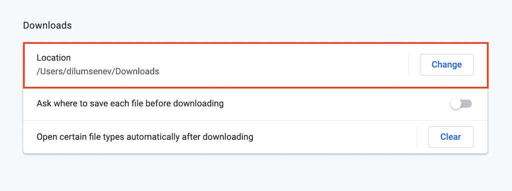 Revisit Chrome’s Settings page and select Advanced > Downloads on the sidebar. Then, use the Change button next to Location to specify a different directory.
