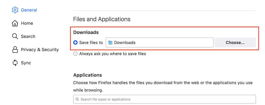 Open Firefox’s Settings page and scroll down to the Files and Applications section. Under Downloads, select the Choose button to pick a different download directory.