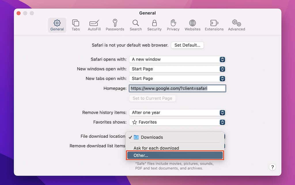 Select Safari > Preferences on the menu bar. Then, under the General tab, open the pull-down menu next to File download location and select Other to change the download directory.