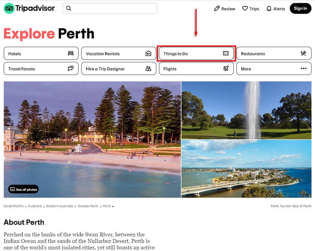 Select Things to Do under the search bar and get browsing! Furthermore, use the links along the top to refine your search for activities or places of interest. When an activity piques your interest, you can select and read more about it along with reviews that people have left.