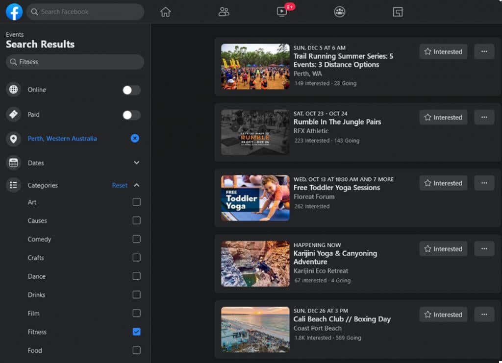 The Events page will list events in your area based on pages that you’ve liked. You can search for particular events and sort by categories in the left-hand menu. Once you select a category, you can choose the location and date of events.