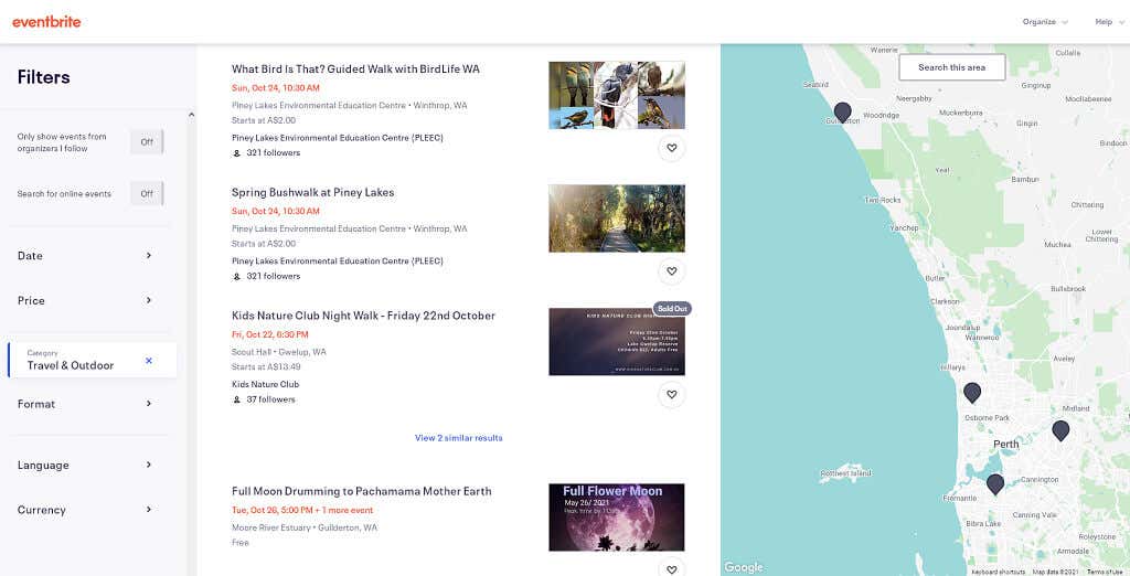 Eventbrite is another website (and app) that allows you to search for things to do never you at any location over a range of dates. Remember that Eventbrite is specifically for events, so if you’re looking for activities, places, or anything else, you should use other methods on this list.