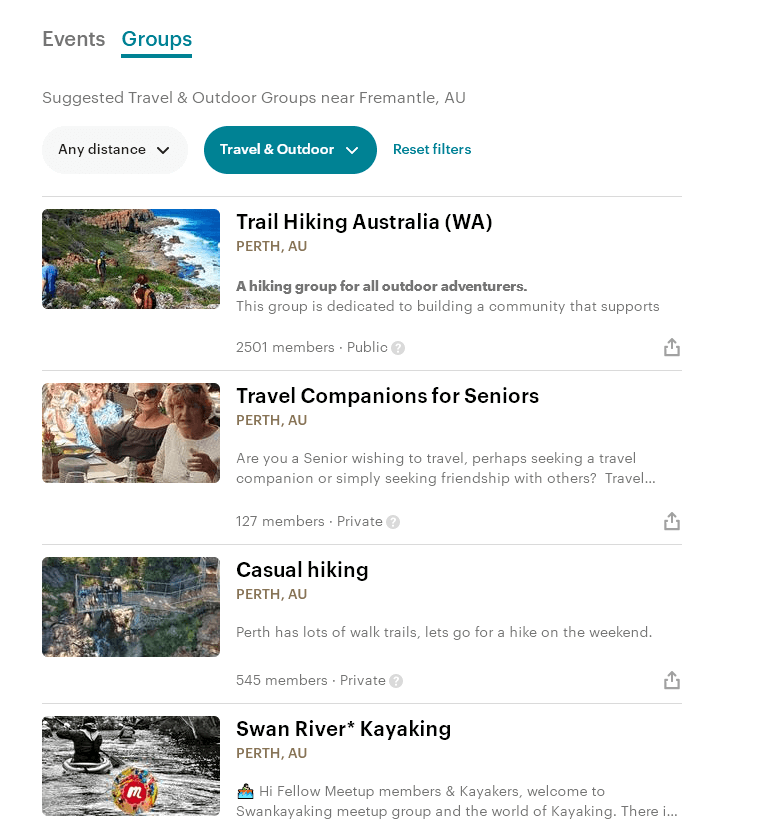 Meetup is an excellent website where you can create or find groups of people interested in particular activities. You can easily search for groups or events in your area and filter these searches by type of activities and events, category, date, and location. For instance, you could find a book club or hiking group near you.