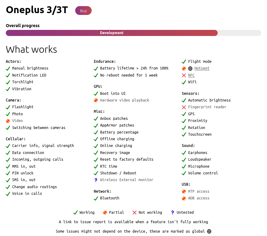 For example, NFC and fingerprint recognition are not functional on the Oneplus 3, and both video recording and playback are patchy. For what it’s worth, this author has been using Ubuntu Touch on a Oneplus 3 for over a year, and it’s been great. Really.