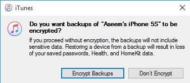When you do this, you’ll get a message asking if you want to encrypt the backup or not. If you choose not to encrypt the backup, then sensitive data like your health data, homekit data and saved passwords will not be stored in the backup. You can also just check the Encrypt iPhone Backup box before backing up to ensure the backup is encrypted.