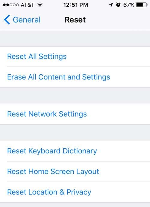 Erase All Content and Settings – This is the factory reset option that will wipe out everything on your iPhone, iPad or iPod. Only use this option if you are sure you have everything backed up and if you want to wipe the device clean in order to give it to someone else or sell it.
